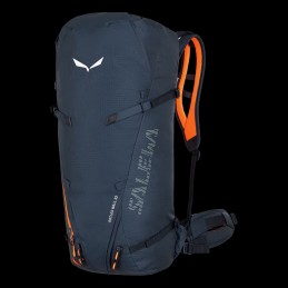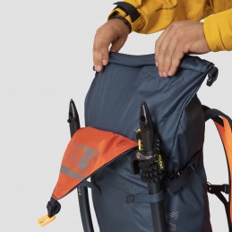 Ce sac comprend une sortie pouvant accueillir une poche à eau. De même, il est accessoirisé avec des bretelles maintenant la charge, des sangles de compression latérales et une sangle supérieure pour la corde avec une boucle clipsable pour garantir un transport plus stable. À la hauteur de vos attentes, ce sac est équipé de solutions intelligentes pour attacher des bâtons de randonnée et des piolets, ainsi que de sangles détachables pour un portage frontal ou en diagonale des skis. En complément de la fermeture roll-top, le sac dispose d’un zip latéral et d’un compartiment avant, séparé par une fermeture Éclair imperméable, pour accéder rapidement et directement à vos effets personnels. Il vous est possible de modifier la configuration du sac pour gagner du poids en retirant le panneau de stabilisation interne (ISB) et le rembourrage de la ceinture.